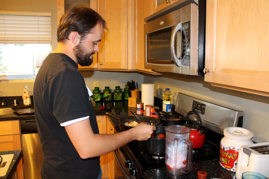 Ephraim comes from a big family and has a lot of younger siblings who come over to eat his great cooking; note the chalk door in the background where all sorts of drawings have been created by siblings and others. Such a cool big brother!